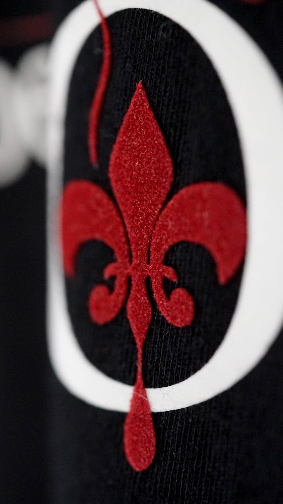 Zdobienie to nadruk typu flock o fakturze weluru.