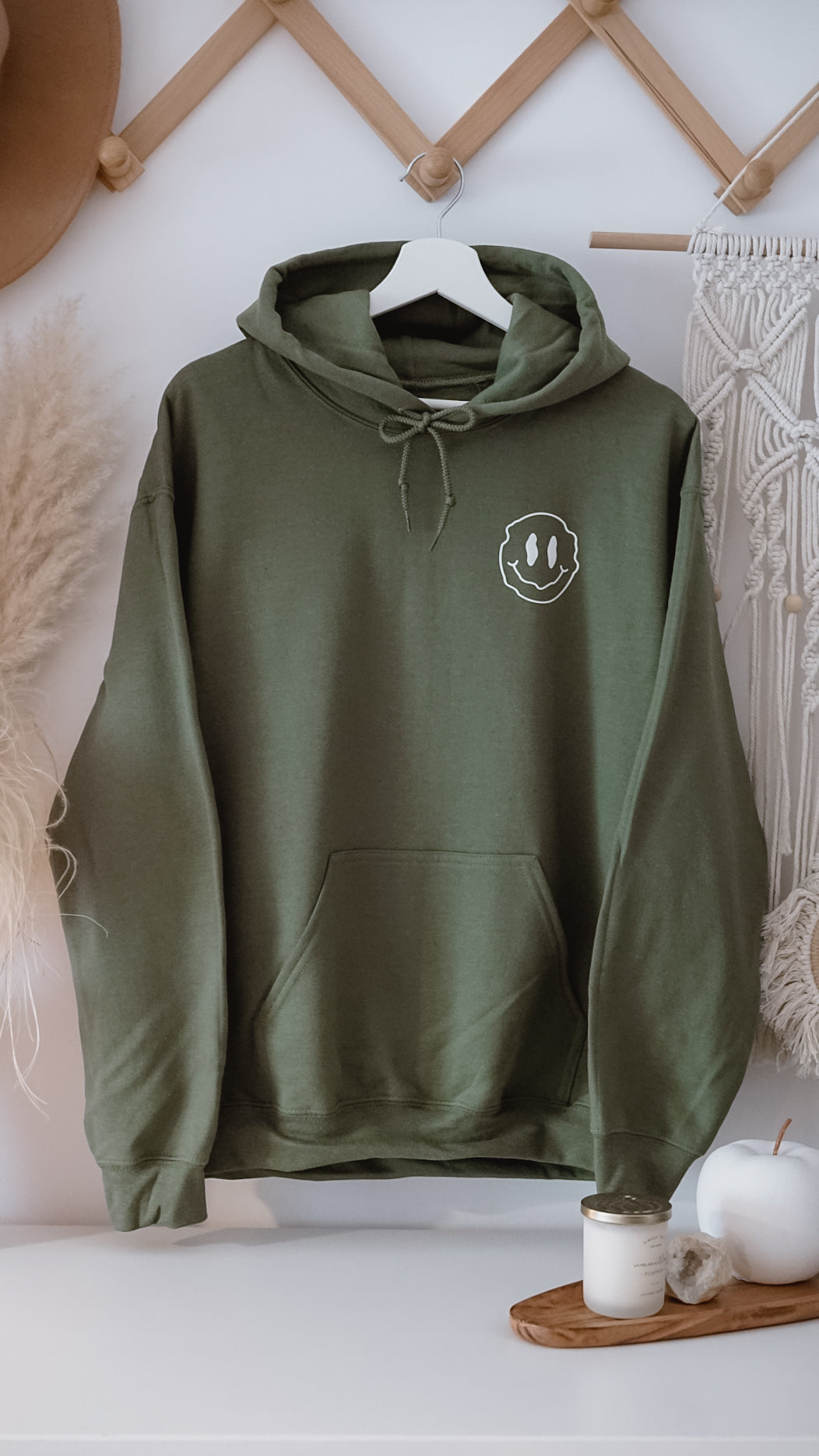 Wzór na plecach został wykonany z białego winylu. Ikonka smiley została wykonana z materiału typu „flock”. Bluza została ozdobiona ręcznie.