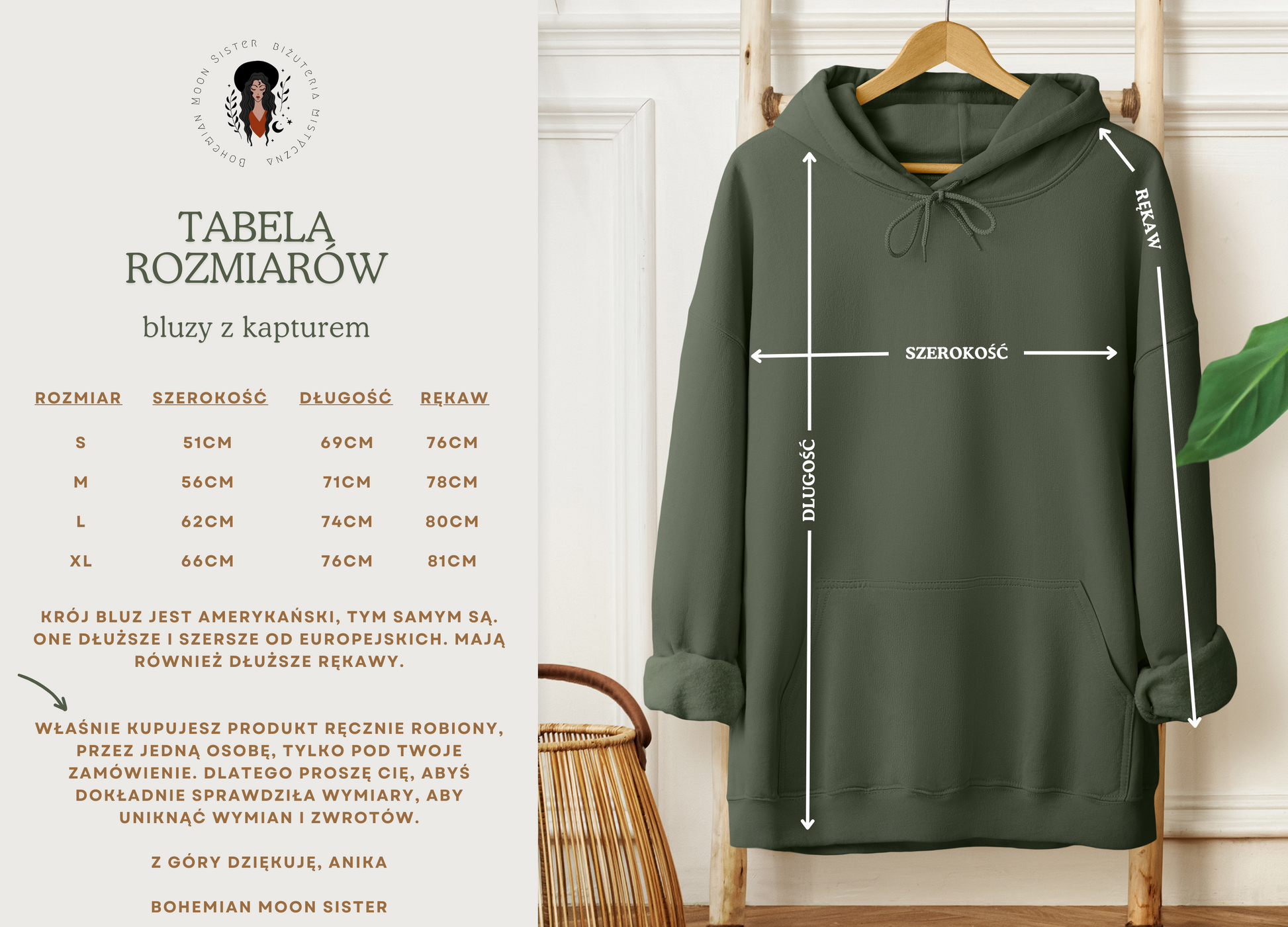 Właśnie kupujesz produkt ręcznie robiony, przez jedną osobę, tylko pod Twoje zamówienie. Dlatego będę bardzo wdzięczna jeżeli dokładnie sprawdzisz wymiary, aby ograniczyć ilość wymian i zwrotów. Ściskam, Anika Bohemian Moon Sister
