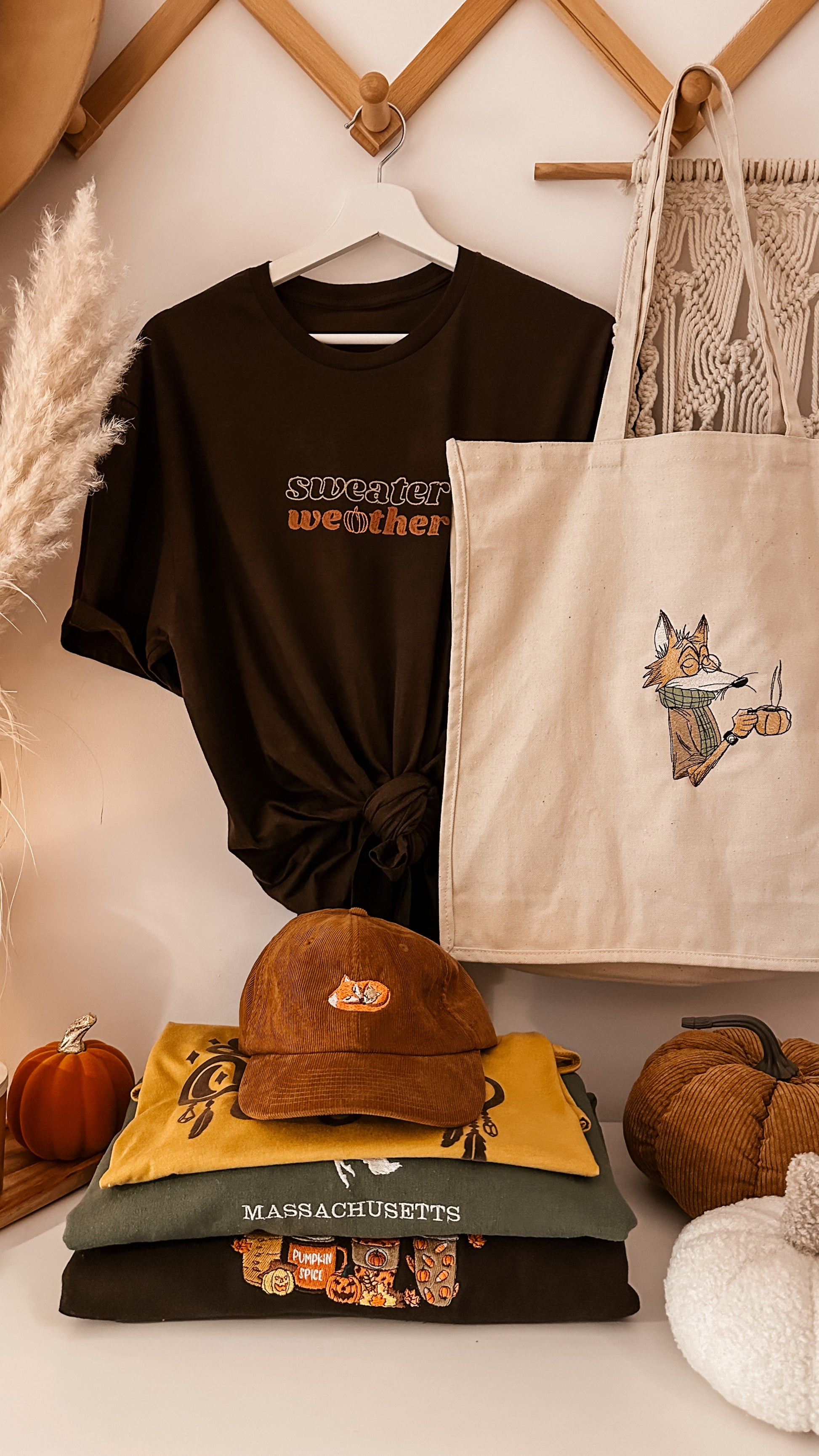 Bawełniana i obszerna torba typu tote z przepięknym haftem lisa w szaliku pijącego kawę.