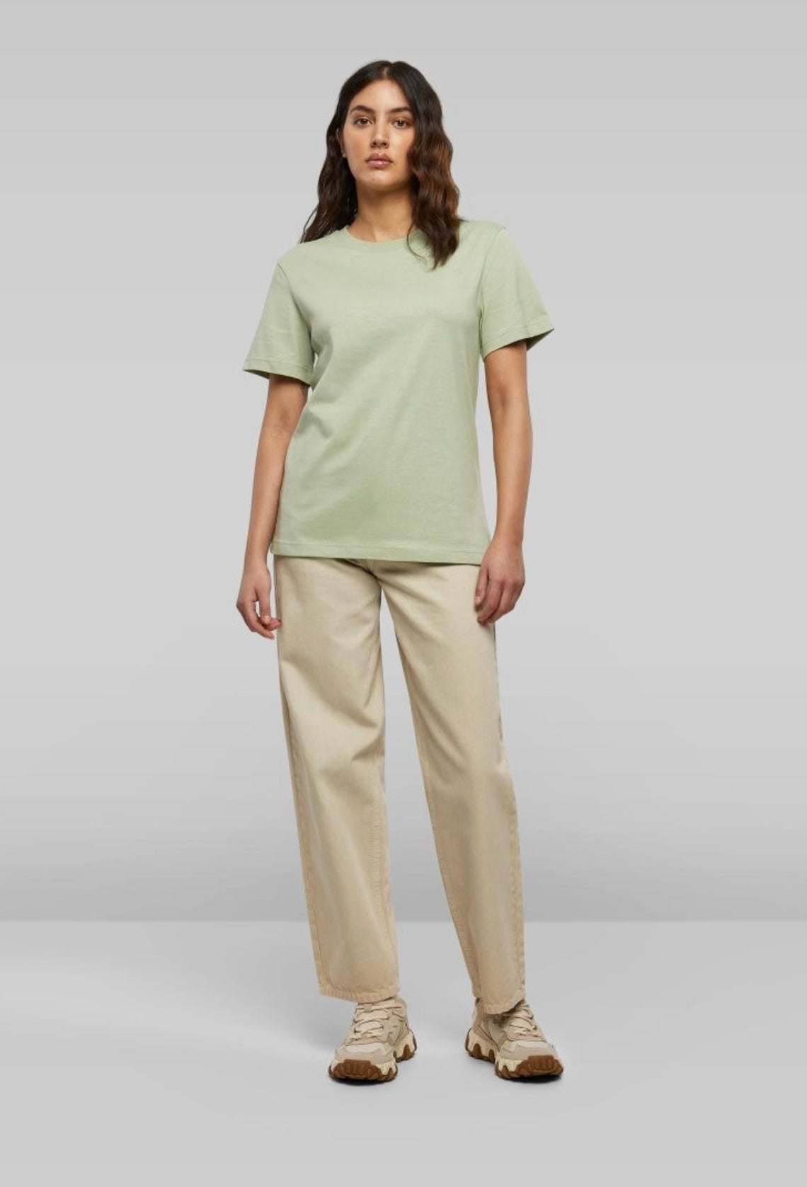 Kolor koszulki to jasna szałwia. Koszulka jest gruba, ale miękka, ładnie układająca się na sylwetce.