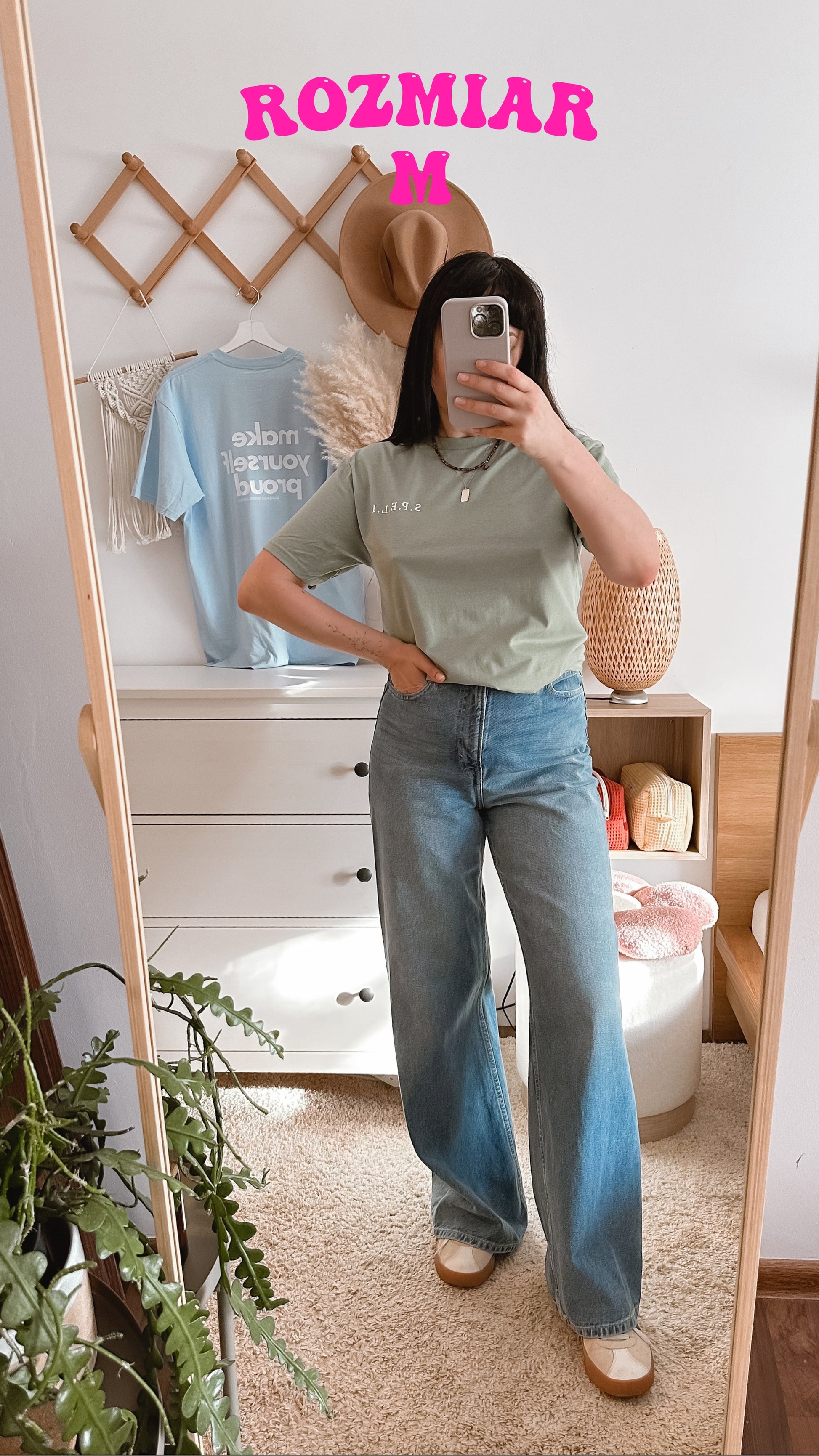 Kolor koszulki to szałwia. Koszulka jest miękka, o kroju unisex, oversize