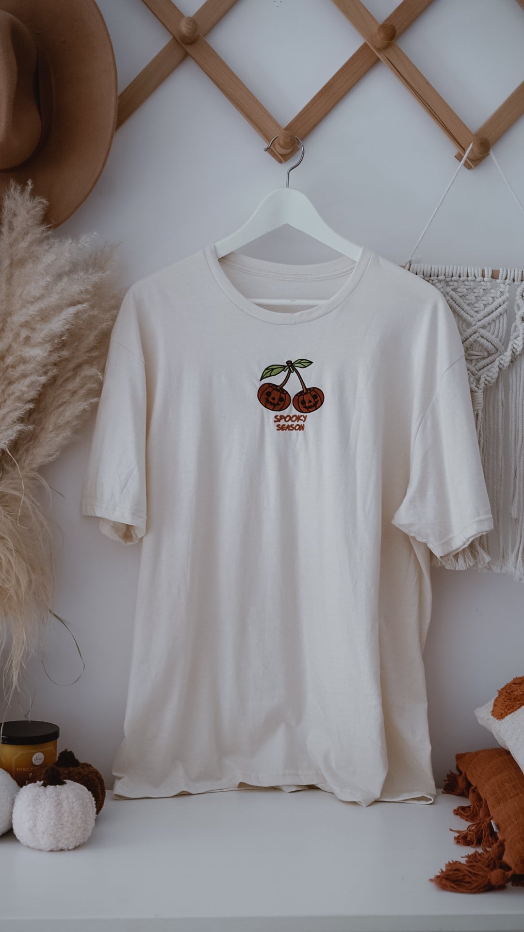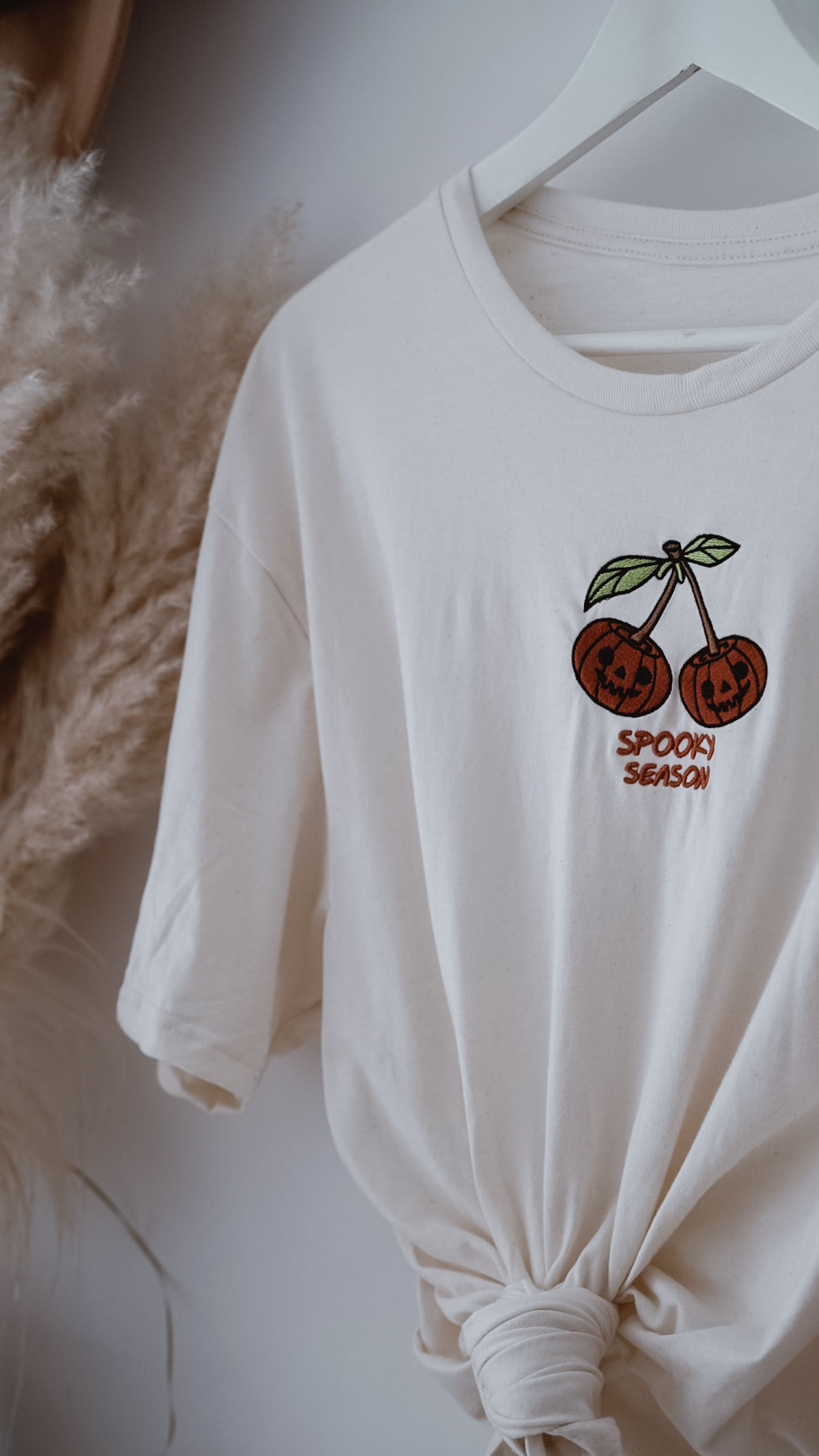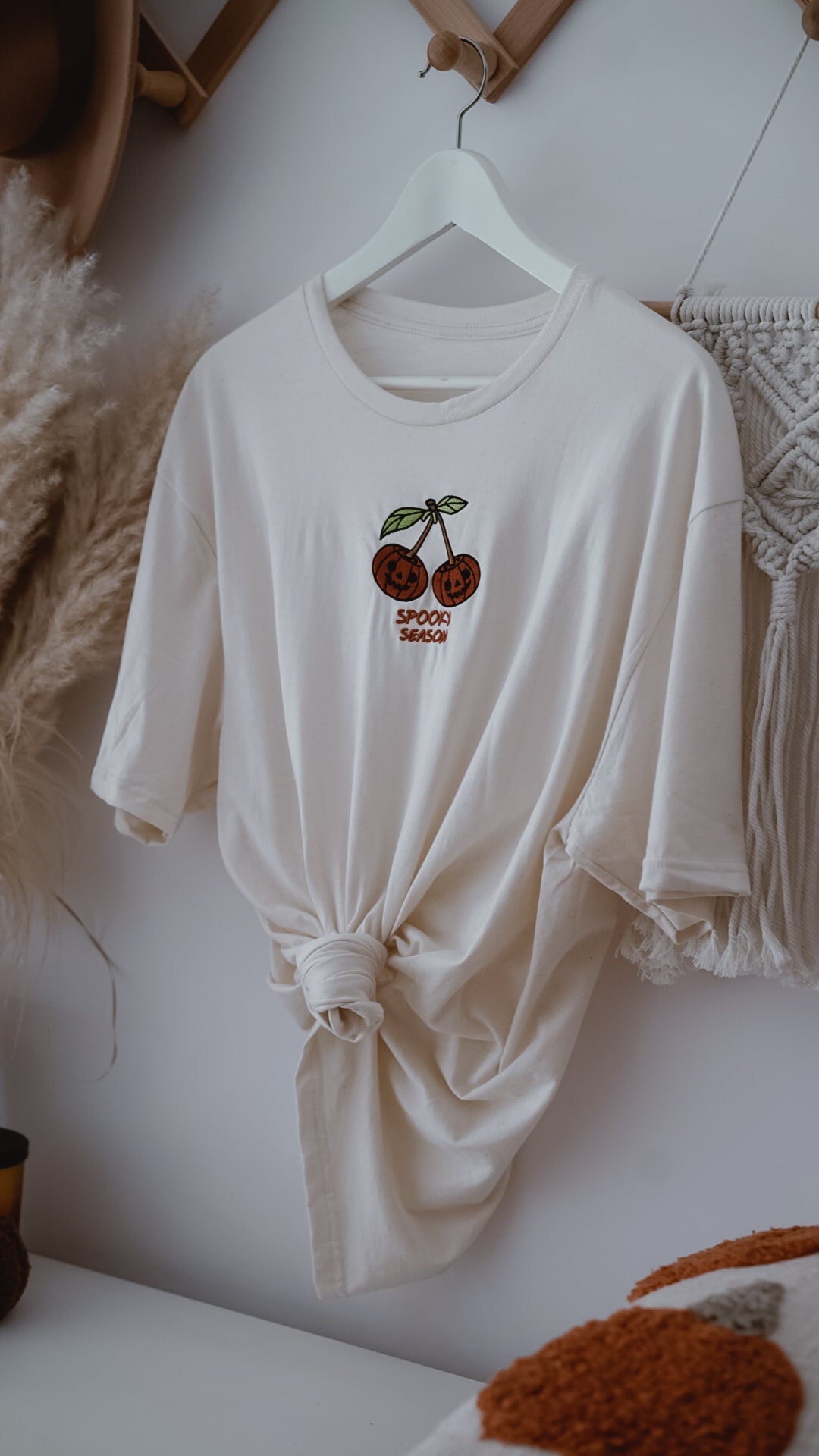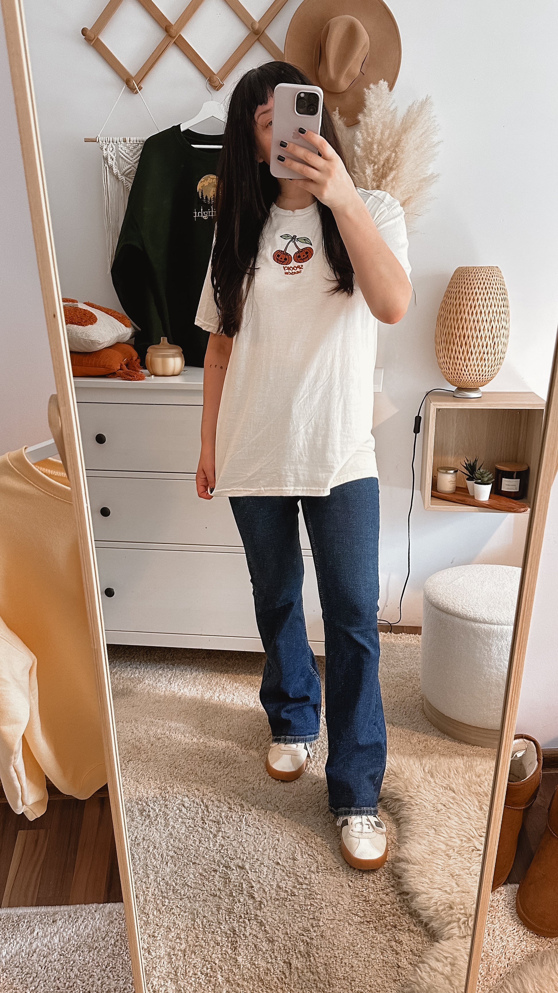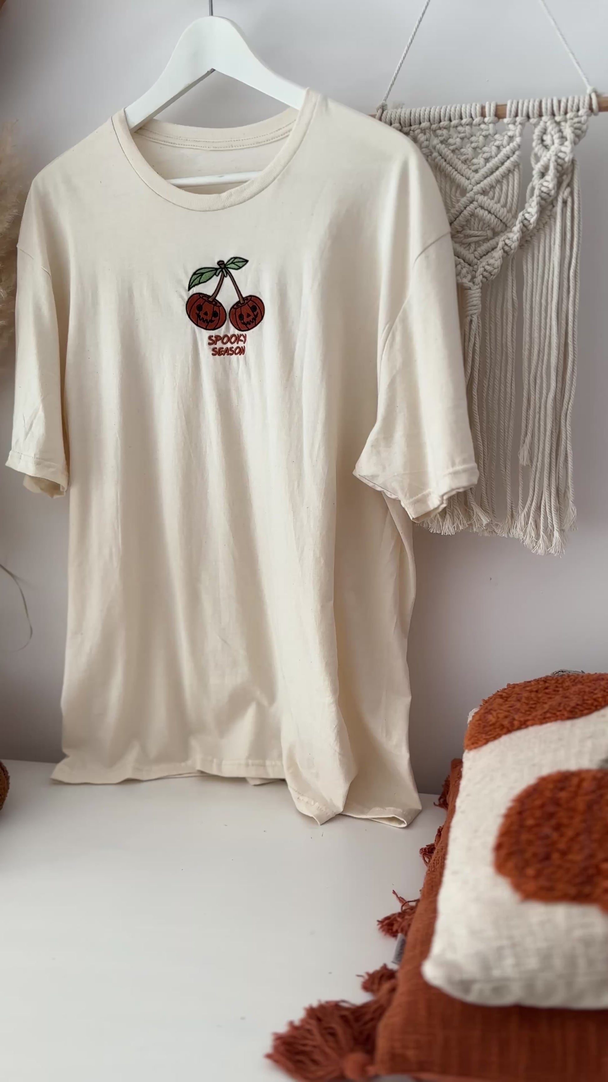 Kolor koszulki to kremowy przypominający len. Koszulka jest miękka, ładnie układająca się na sylwetce. Nadruk o kolorze bordowym.